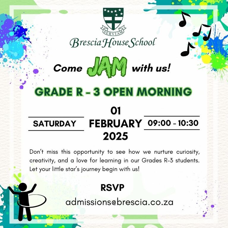 Come JAM with us! Join us at our Grade R – 3 Open Morning on Saturday, 1 February from 09:00 – 10:30. Don’t miss this opportunity to see how we nurture curiosity, creativity, and a love for learning in our Grades R–3 students. Let your little star’s journey begin with us!To confirm attendance: admissions@brescia.co.za