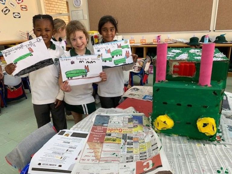During the last week of the second term, the Grade R girls worked on their Inquiry Based Learning task. The theme was occupations and the girls were encouraged to fully explore and enjoy constructive play. The girls also participated in theme discussions about the different vehicles and buildings that are used by "people who help us." Girls were put into groups and planned their construction. They then drew a picture of what their vehicle/floor plan would look like bearing in mind the material that they have. Thereafter, the girls constructed their vehicle/floor plan using the recycled material that had been collected earlier, and then they painted and added the finishing touches.