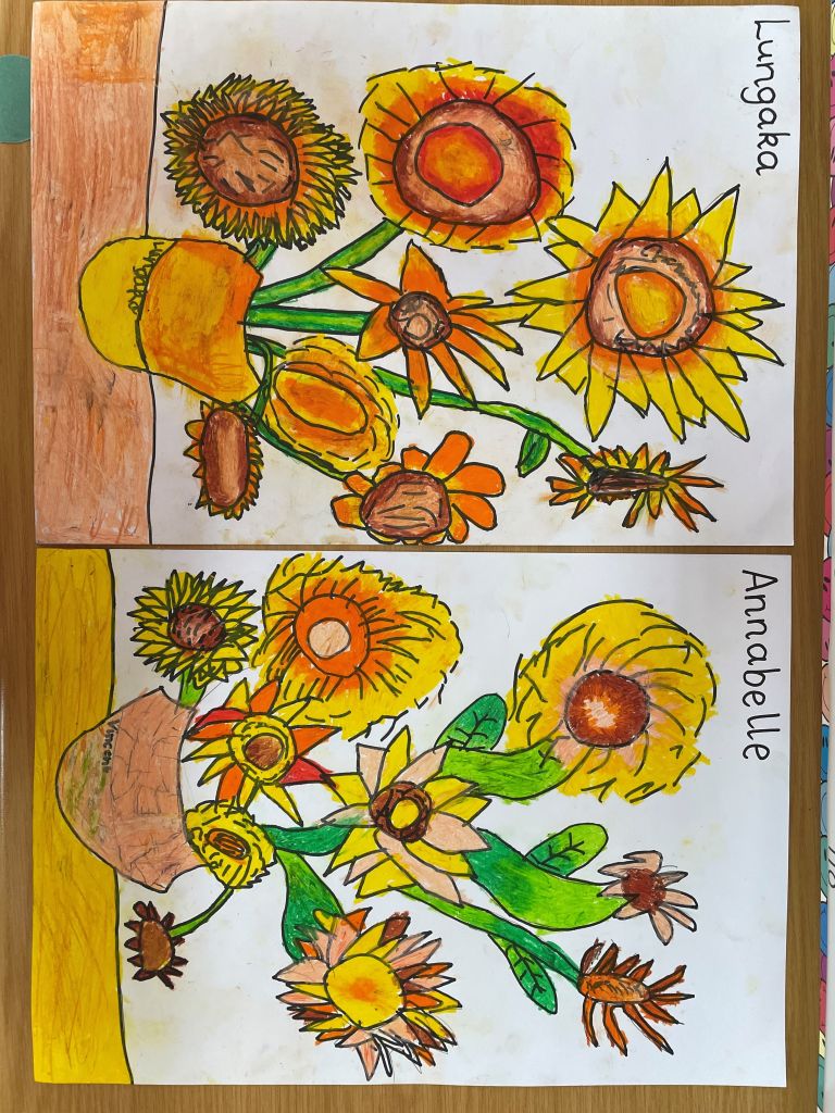 The Grade 1s studied Famous Artists last term and they have just finished the painting part of their Van Gogh Sunflower renditions. We think they are simply beautiful.