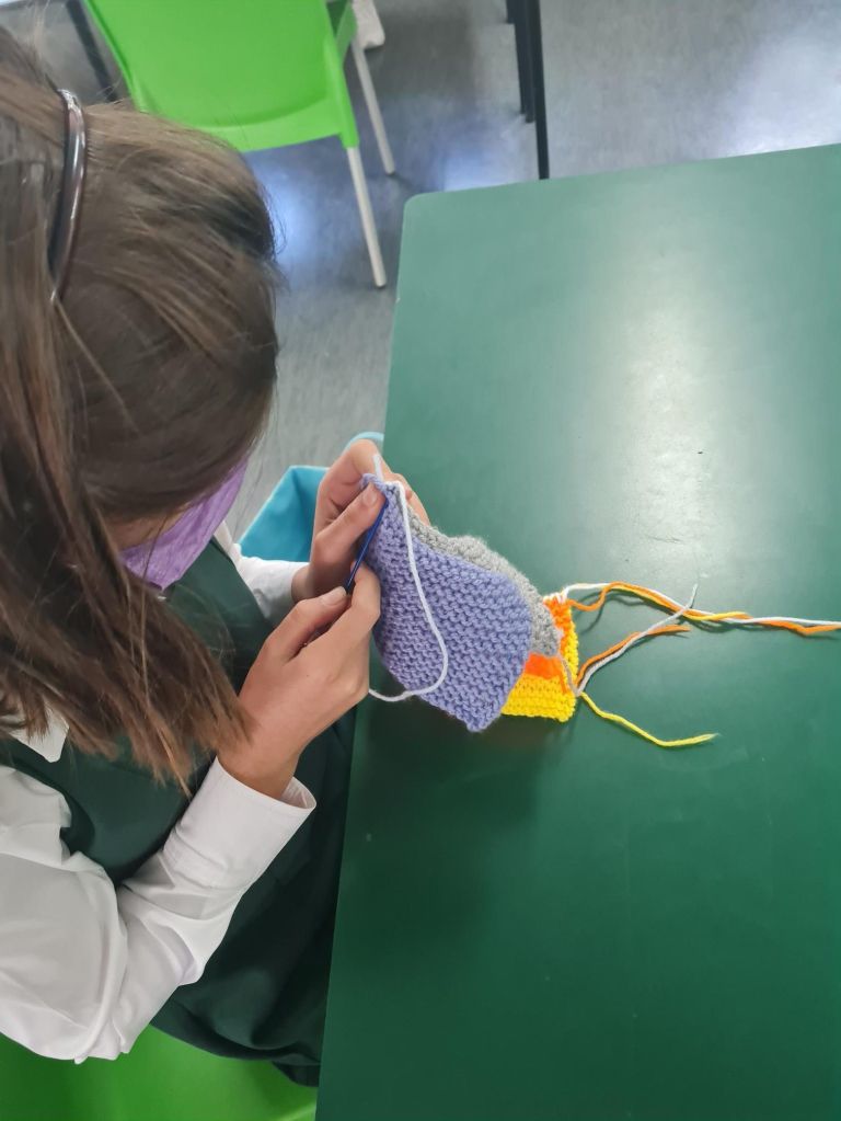 The Serviam Club girls are learning to sew squares together neatly to make their first baby blanket. Better together we serve showing the spirit of Serviam.