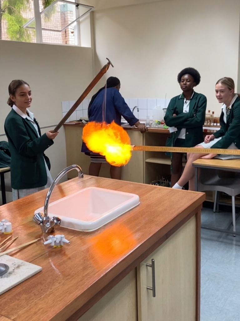 Teaching Physics with a BANG! Our Grade 9 students got to experience the different properties of metals and non-metals first-hand by demonstrating just how flammable hydrogen is.